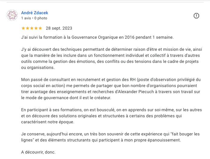 Aleksander Piecuch est executif-mentor, chercheur et pratiquant de l’intelligence collective systémique depuis plus de 30 ans, coach en individuation, formateur et inventeur d’un des systèmes complets de gouvernance les plus avancés, notamment sur le plan de l’équilibre entre l’approche horizontale et verticale et du fonctionnement en intelligence collective systémique de 4e génération : la Gouvernance Organique®.