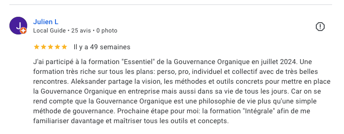 Le Parcours : Après avoir posé le cadre GO, nous traverserons l’ensemble des outils de la GO les appliquant aux problématiques des participants. Le programme (voir ci-dessous) propose des outils pour gérer les tensions interpersonnelles et organisationnelles (7 types), comprendre l’évolution de la conscience via la Spirale Dynamique, et aligner projets professionnels et missions de vie personnelles et collectives. Il aborde également l’intelligence collective systémique et la prise de décision par consensus pour un fonctionnement organique connecté, permettant de dépasser les jeux d’ego et de pouvoir.